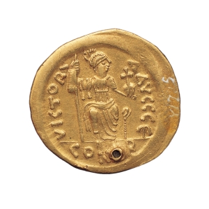 东罗马金币东罗马查斯丁二世时期直径2.1厘米,重4.4克1953年陕西省咸阳市底张湾出土金币正面是国王正面半身像,铭文由王像右手侧开始,意为“我们的主上查斯丁二世,永恒的皇帝”。背面为一着盔甲的女神像,其座下的铭文是印铸于君士坦丁堡的意思。由女神像右侧下方开始,亦有铭文自下而上排列,几乎环绕一周,其意为“至尊们的胜利”。末尾E字为铸币厂局 ...