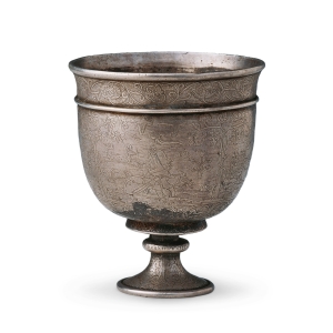 狩猎纹高足银杯唐高7.4厘米,口径6.3厘米1963年陕西省西安市沙坡村窖藏出土银杯经锤揲成型,圆唇侈口,直壁深腹,腹下部略收,下承外撇高足。纹样则采用堑刻工艺,鱼子地纹,杯腹上部饰一道凸弦纹,下部阴刻一道弦纹,高足中部有“算盘珠”式节。口沿下刻一周缠枝花,两道弦纹之间饰有骑马狩猎图四幅,猎者策马飞驰,姿态各异,或张弓待射,或箭方离弦,被 ...