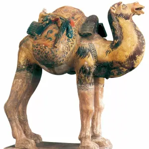 唐彩绘釉陶载物骆驼俑 陕西咸阳市礼泉县郑仁泰墓出土 现藏陕西历史博物馆唐彩绘釉陶载物骆驼俑,高43.5厘米。1971年陕西省咸阳市礼泉县郑仁泰墓出土,现藏于陕西历史博物馆。骆驼为白胎,外施黄釉,上施彩绘,以墨笔描绘眼睛、鬃毛等细部。骆驼昂首站立,驼峰间置鞍架,上垫圆形花毯,横搭一装满物品的袋子,袋子两边挂着丝卷、扁壶、刀鞘、箭囊等日用品以 ...