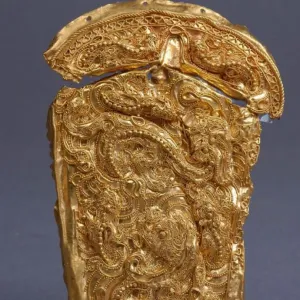 带扣的出现可以追溯到春秋晚期,战国时就比较常见了。经过秦汉两代的发展,到两晋时,带扣基本上取代了带钩,不仅成为服饰的重要组成部分,而且在日常生活中也得到了广泛应用。从古到今,带扣都是人们束结腰带的主要用具,在古代,其材质主要有金、银、铜、玉等。 天水市博物馆馆藏的国家一级文物东汉掐丝焊珠蟠螭纹金带扣,长7.7厘米,宽5.4厘米,重42 ...