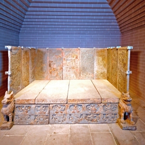 隋贴金彩绘围屏石榻长218厘米,宽115厘米,高123厘米,秦州区石马坪出土,国家一级文物。棺床呈长方形,由大小不等的十七方画像石和八方素面石床组成床座、床板、围屏。其中由八方高33厘米、长短不等的素面石条和八方画像石组成床座。床板由长51.5-59厘米、宽115厘米的石条拼成,各拼缝间有子母榫卯相扣接。床的边沿除正面外,三面距床沿4厘米处镌刻成深 ...