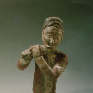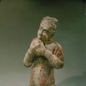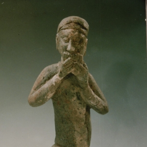 贴金彩绘执横笛乐伎俑 隋代 俑高32厘米 乐伎俑位于石棺床左侧三。 身着圆领紧袖,左衽束腰长袍,头戴高角软巾,深目高鼻,跪坐姿势,双手执横笛,作吹奏状。