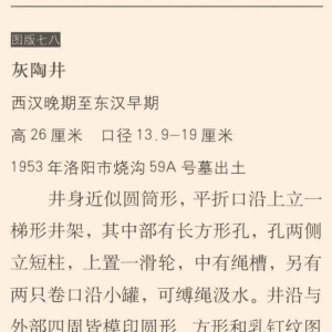 图版七八灰陶井 西汉晚期至东汉早期 高26厘米,口径13.9 -19厘米 1953年洛阳市烧沟59A号墓出土井身近似圆筒形,平折口沿上立一梯形井架,其中部有长方形孔,孔两侧立短柱,上置一滑轮,中有绳槽,另有两只卷口沿小罐,可缚绳汲水。井沿与外部四周皆模印圆形、方形和乳钉纹图案。(参见洛阳区考古发掘队:《洛阳烧沟汉墓》,科学出版社,1959年) ...