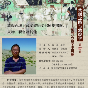 2021年11月28日下午,西南民族大学杨铭教授受邀在“丝绸之路与敦煌学”系列公益学术讲座主讲《敦煌西域古藏文契约文书所见部族、人物、职官及其他》。本次讲座由敦煌文献研究所主办,赵晓星研究员主持。敦煌研究院的专家学者,西南民族大学、中国人民大学、四川大学、北京大学、兰州大学、西北师范大学、北方民族大学、西北民族大学、宁夏大学的师生及敦煌 ...