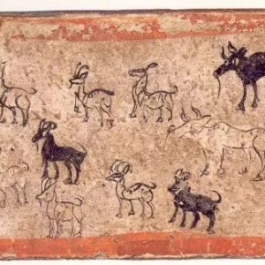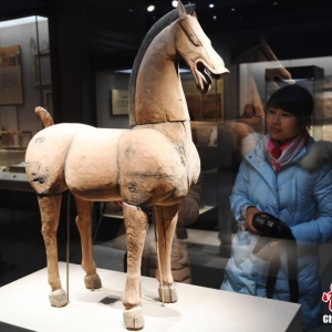 甘肃省高台县博物馆“鬼斧神工——高台汉晋彩绘木刻珍品”展览吸引观者。汉魏晋时间,木刻用具在人们生产生活中用途广泛,高台出土的彩绘木刻文物有木马牛车、彩绘木佣、动物佣、木质楼院以及众多的生活用具。制作工艺运用了阴刻、圆雕、镂雕、透雕等多种类型。其中彩绘木马牛车,造型简洁、雄壮浑朴,形象的反映了当时丝绸之路交通的盛况,从一个侧面反映了当时交通工具的制作水品。中新社记者 杨艳敏 摄二月,甘肃省高台县博物馆 ...