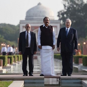 图为2018 年 2 月 21 日在新德里拍摄的资料图片,显示了毗邻联合国教科文组织世界文化遗产印度胡玛雍王陵的十六世纪古典花园建筑群遗址落成典礼期间,印度副总统文卡亚•奈度(Venkaiah Naidu,中)、新德里副市长巴加尔(Baijal,左)及卡里姆•阿迦汗四世王子(Karim Aga Khan IV,右)合影留念。图片来源:法新社/莫尼•夏尔马。 中国文物网3月5日编译报道:在印度首都新德里市中心,一座曾经被遗忘的莫卧儿 ...