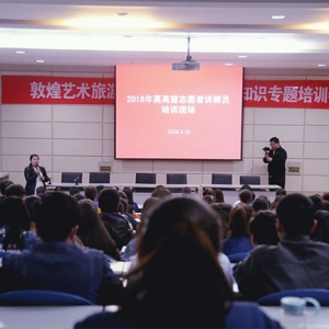 3月29日,莫高窟大学生志愿者讲解员培训开班式在西北师范大学敦煌学院阶梯教室举行。敦煌研究院接待部领导及培训老师十余人和敦煌学院师生一百余人参加了本次开班仪式。接待部罗瑶主任代表敦煌研究院致词。罗主任首先向敦煌学院2017届同学们介绍了我院与敦煌学院开展院校间教学与实践活动的历程,对三年来开展的莫高窟志愿者讲解员行动进行了回顾与总结,充分肯定了敦煌学院大学生志愿者为弘扬敦煌文化、传播石窟艺术做出的贡献, ...