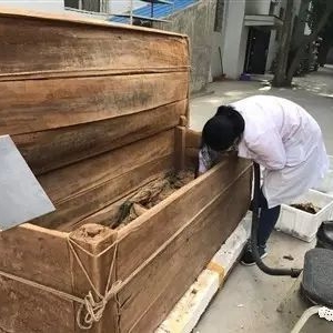 ▲考古人员在用特制吸尘器清理木棺中的尘土。这口木棺的盖板和棺身由木制暗轴相连,可以自由开合。 近日,新疆文物考古研究所工作人员对和田洛浦县比孜里墓地中两口木棺进行了开棺清理,这两口木棺形制罕见、葬式奇特,加上它们保存完好,具有展览价值,去年4月,被考古人员从比孜里墓地运回。 两口木棺中,一口木棺可以自由开合,棺中有3具干尸,身着鲜艳的衣物,脸部裹有毛绣或丝棉的覆面,覆面下面有类似口罩一样的护颌罩 ...