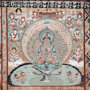 莫高窟第361窟千手千钵文殊变该经变主要依据失译者名今附不空译《大乘瑜伽金刚性海曼殊室利千臂千钵大教王经》绘制,此经有10卷之巨,但译者和译出时间不很清楚,学者一般认为是杂糅《华严经》、《梵网经》和密教金胎二部的疑伪经,后人(日本僧人?)编造的《经序》云译于开元二十八年(740)。在该经译出之前,千手千钵观音就出现在画坛。张彦远《历代名画记》卷3记载初唐尉迟乙僧在慈恩寺塔下南门画有千钵文殊像,段成式《酉阳 ...