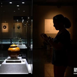 6月23日,观众在文物展上参观。 文物展上展出的“三彩印珍珠地贴兽面纹凤首壶”。 文物展上展出的“金树”。 新华社讯 (记者 刘潇)6月22日起,“瞻礼大唐——‘一带一路’背后的器用”文物展在西安唐皇城墙含光门遗址博物馆展出,展品选取了反映唐代人社会与生产生活的金银器、铜器、玉器、瓷器陶器等各种材质的文物共90件(组)。据悉,展览将持续至7月22日。