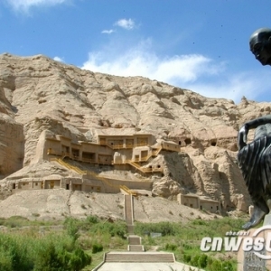 敬泽昊新疆库车克孜尔石窟前树立的鸠摩罗什像,这里是他的故乡