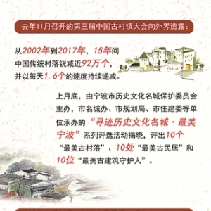 制图 张悦 上月底,由宁波市历史文化名城保护委员会主办,市名城办、市规划局、市住建委等单位承办的“寻迹历史文化名城·最美宁波”系列评选活动,经过初评、社会公众投票、专家综合评定,最终评出10个“最美古村落”、10处“最美古民居”和10位“最美古建筑守护人”。 这一活动,激起了公众对古村落古民居的保护热情,也引起人们对如何保护古村落古民居的关注和思考。 古村落古民居 数量持续递减 古 ...