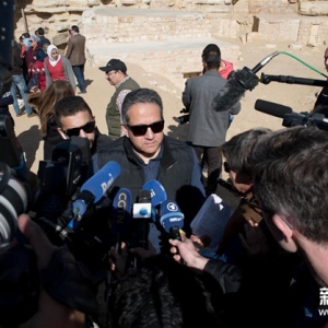 12月15日,在埃及首都开罗以南约30公里的阶梯金字塔附近,埃及文物部长哈立德·阿纳尼(中)接受媒体采访。新华社记者邬惠我摄 埃及文物部长哈立德·阿纳尼15日在首都开罗以南约30公里的阶梯金字塔附近宣布,埃及考古队在此处发现一座距今4400年且保存相当完好的王室祭司墓葬。 阿纳尼在发掘现场对新华社记者说,墓室门楣的文字显示,墓葬主人是埃及古王国第五王朝时期法老内费里尔科勒的祭司,墓室内有墓葬主人及其 ...