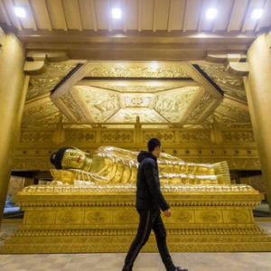 12月7日,山西太原太山龙泉寺舍利塔复建工程正在进行,其中用65吨纯铜打造的仿唐地宫基本完工,金碧辉煌的内饰在灯光的照射下熠熠生辉。中新社记者 韦亮 摄