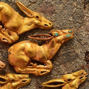 哈萨克斯坦塔尔巴哈台的一处石岗堆出土大量黄金无角鹿、 青铜箍、 珠宝首饰、 金珠,甚至还有准备实施防腐处理的古人遗骸。经过两个月的发掘及后续研究,考古学家再次得出结论:塔尔巴哈台山全面呈现出铁器时代的早期文化。始于2016 年6月塔尔巴哈台山考古调查,在海拔1500米的山谷中发现独特的墓葬,称为ElekeSazy,并对库尔干Alike saz-2七号墓进行发掘。此墓封土直径约35米,高1.8米。In one of the mounds archaeological Tarb ...