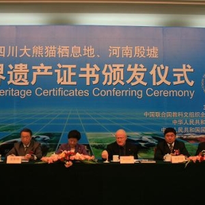 图片来源:国家文物局世界遗产处 刘华彬 四川大熊猫栖息地和河南殷墟世界遗产证书颁发仪式25日在北京人民大会堂举行。 国务委员陈至立出席仪式,并与联合国教科文组织世界遗产中心主任班德兰共同向四川、河南两省颁发了世界遗产证书。 国家文物局局长单霁翔,教育部副部长、中国联合国教科文组织全国委员会主任章新胜,建设部副部长仇保兴 ...