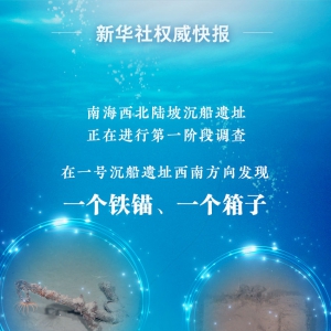 经国家文物局批准,由国家文物局考古研究中心、中国科学院深海科学与工程研究所、中国(海南)南海博物馆3家单位联合组成的深海考古队日前搭乘“探索一号”科考船,在南海西北陆坡一号、二号沉船遗址海域进行第一阶段调查,近日在一号沉船遗址西南方向发现一个铁锚和一个箱子,铁锚和箱子相距约50米。铁锚下部呈半埋藏状态,出露两只锚爪,锚杆为圆柱形, ...