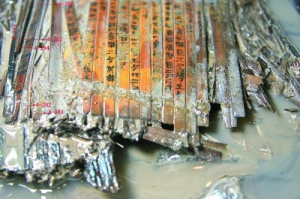 细长的深棕色竹简被棉线固定在透明玻璃片上,8支至10支为一组,浸泡在蒸馏水中等待杂质析出;旁边装满黄色加固试剂的试管内,一支支清理后的竹简则静静“沉睡”,待脱水加固完成后,它们将被取出,再进行干燥定形、粘接修复等步骤……6日,中新网记者独家探访成都文物考古研究院文保中心,直击“天回医简”文物保护修复现场。肖嶙正查看试管中的竹简脱 ...