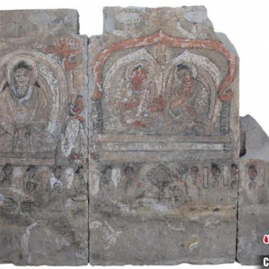 从山西省考古研究院获悉,考古人员在大同仝家湾发现一座北魏邢合姜墓石椁,该墓葬有明确纪年,石椁四壁及顶部皆绘有佛教题材壁画,并残存彩绘。这种全景式反映佛教题材的墓葬壁画在北魏平城时期尚属首次出现。北壁石板。 吕晓晶 摄 这座墓葬出土有明确纪年的石碑,石椁整体为长方形屋宇形式,壁画所绘佛教人物形象、佛教人物动作、包括龛内二佛并 ...
