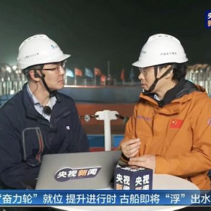 11月21日零时43分,“长江口二号”古船初露端倪。随着水面上的水波一阵荡漾,支撑沉箱的两个弧形梁构件最先浮出水面,紧接着,一个圆弧的物品浮出水面,现场专家推测为桅杆。现场可以看到桅杆表面并不光滑,应该是海洋的一些附着物。随着桅杆出水,沉箱将逐渐缓慢上浮,直至完全被奋力轮月池包裹。据上海博物馆馆长褚晓波介绍,之前2019年打捞出水的桅杆, ...