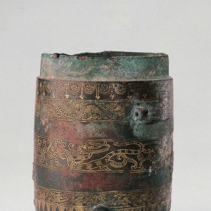 十六国时期·前凉高11.7厘米,口径7.9厘米,重0.682千克1966年本馆征集体呈圆形竹筒状,下有三马蹄状短足,器外壁饰金错龙虎纹。依据器形分析,此器原应有盖,现已遗失。器底有金错铭文四十七字。刻款中有器名、制造地点、制造时间、政府部门、监工官员、错金匠以及铸造匠的名字。据刻款可知,这件筒形器是用来盛装封泥的。在我国古代,封泥是用来封箴那些 ...