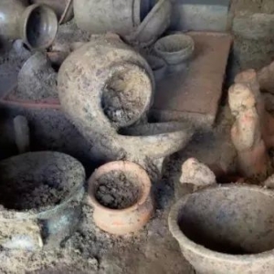 中新网重庆5月15日电 (记者 钟旖)记者15日从重庆市文物考古研究院获悉,重庆市江北区北滨路一工地新发现一座千年汉代崖墓。经发掘清理出土文物56件(套),时代初步判断为东汉时期。图为古墓出土的文物(视频截图)。 重庆市文物考古研究院供图 据介绍,2023年4月中旬,江北区北滨路一工地在施工过程中,意外发现一古墓,当地立即采取临时性保护措施, ...