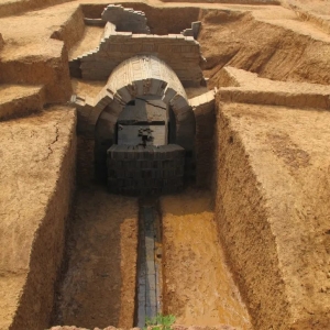 2011年,我院在西善桥岱山保障房工地发掘了一批六朝至明清时期墓葬。其中M10时代为东晋晚期至南朝刘宋时期。 M10为平面呈凸字形券顶砖室墓,方向330°。墓圹长7.2、宽4.4米,距现地表3.24米。墓葬形制基本保存完好,有墓道、封门、甬道、墓室等部分。 墓道平面呈梯形,底部斜坡状。排水沟砌筑于墓道中部,系在墓道底部开挖沟槽再砖砌而成。封门墙呈弧形, ...